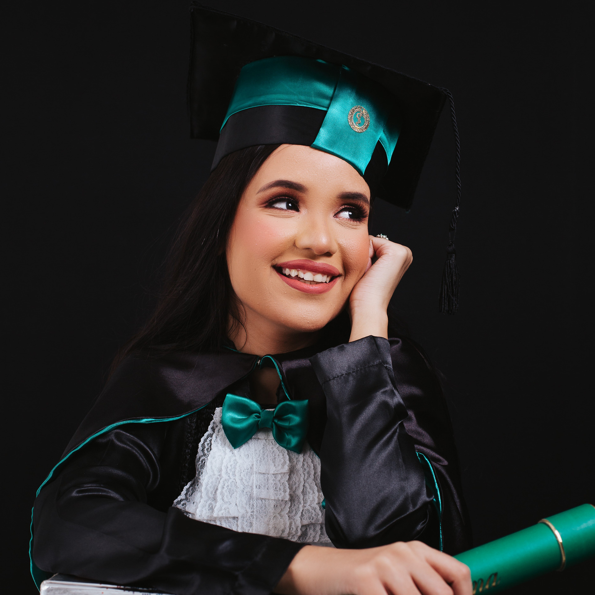 suas fotos de beca, com a família e o
